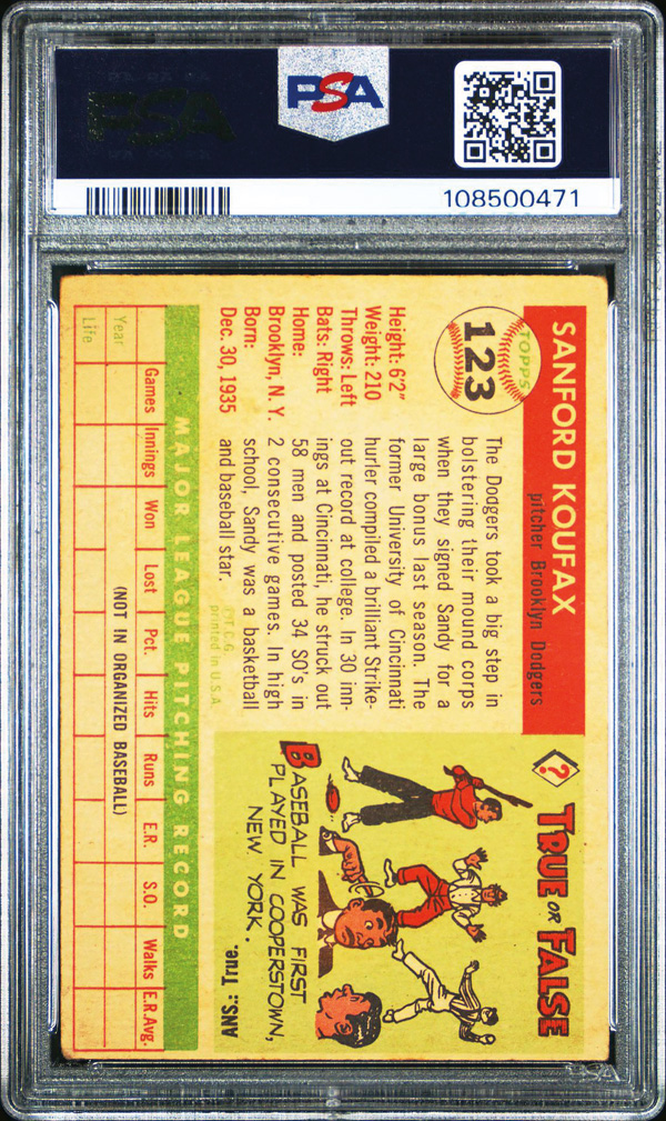 1955 Topps #123 Sandy Koufax Rookie Card PSA 3 VG, Very Good 3. (Image) (Image2)