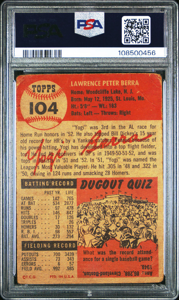 1953 Topps #104 Yogi Berra PSA 1 PR, Poor to Fair 1. (Image) (Image2)