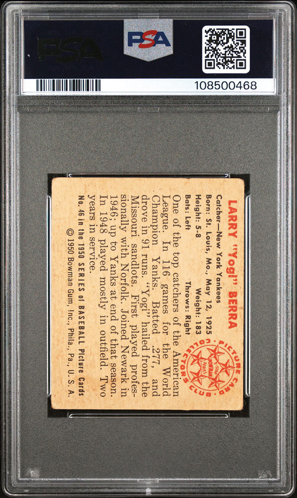 1950 Bowman #46 Yogi Berra PSA 2 Good, Good 2. (Image) (Image2)