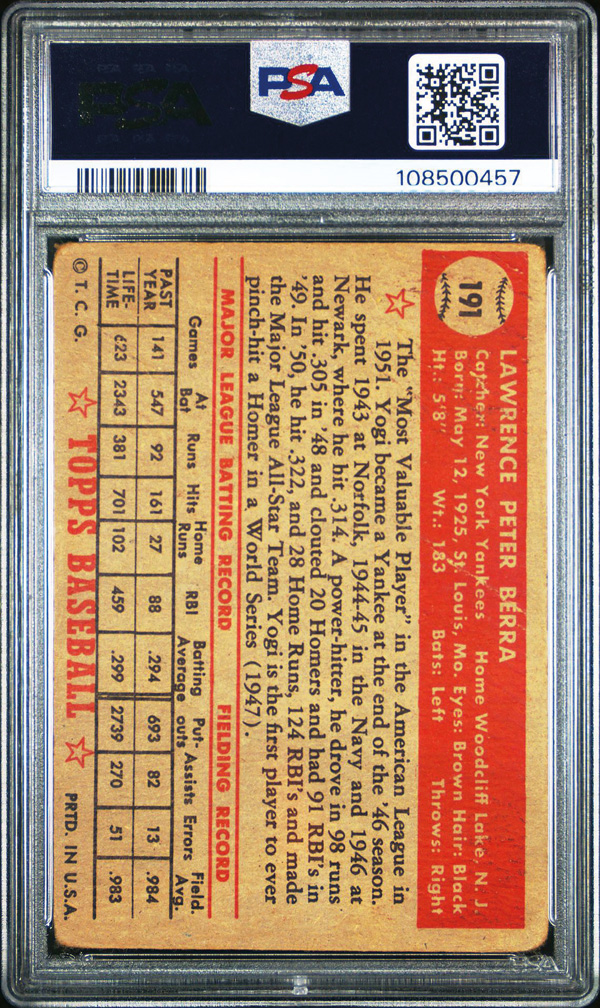 1952 Topps #191 Yogi Berra PSA 1 PR, Poor to Fair 1. (Image) (Image2)