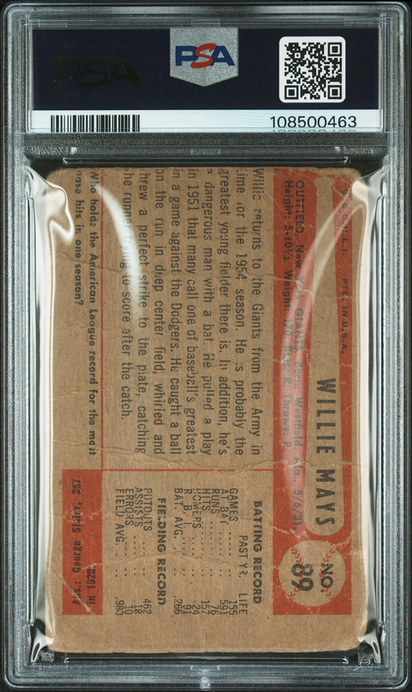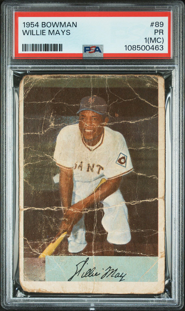 1954 Bowman #89 Willie Mays PSA 1 PR (MC), miscut qualifier. (Image) (Image2)