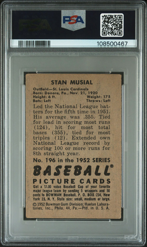 1952 Bowman #196 Stan Musial PSA 2 GOOD, Good 2. (Image) (Image2)