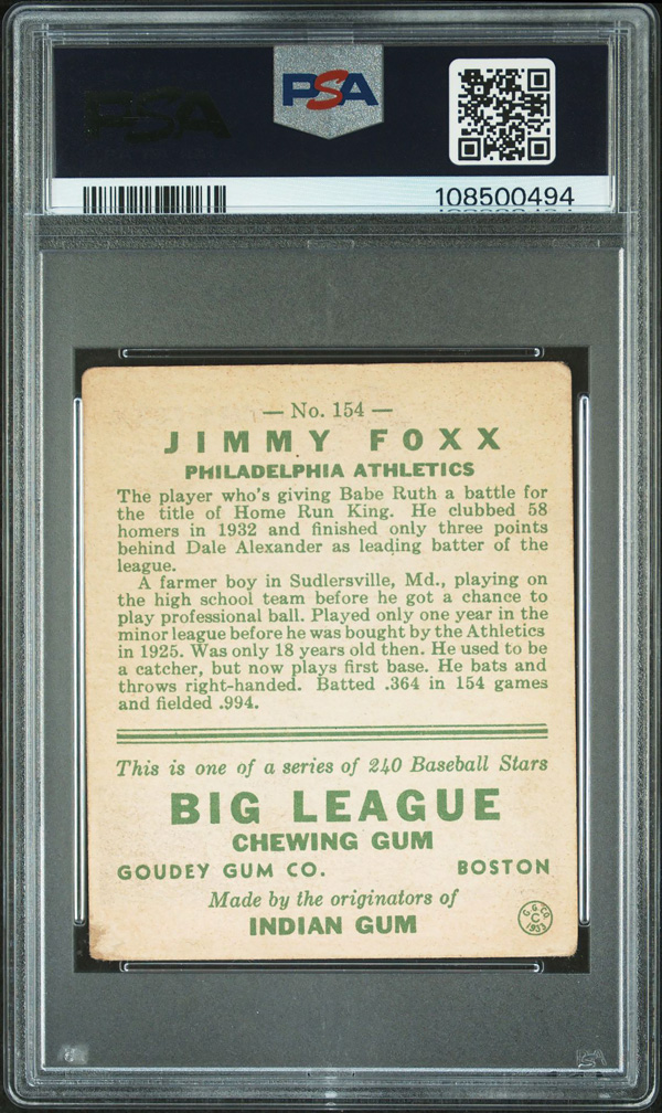 1933 Goudey #154 Jimmy Foxx PSA 2 GOOD, Good 2. (Image) (Image2)
