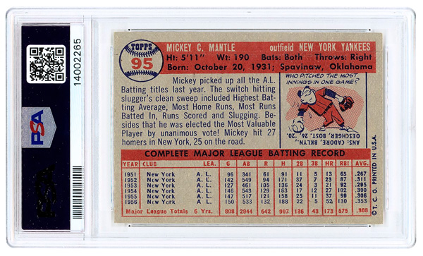 1957 Topps #95 Mickey Mantle PSA 8 NM-MT, perfect centering; crisp edges; amazing color; freshly graded by PSA, Near Mint to