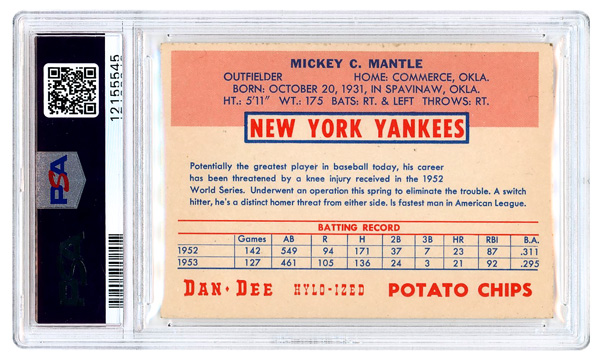 1954 Dan-Dee Mickey Mantle Potato Chips Card PSA 7 NM, phenomenal color; population of 35; extremely rare card to find in