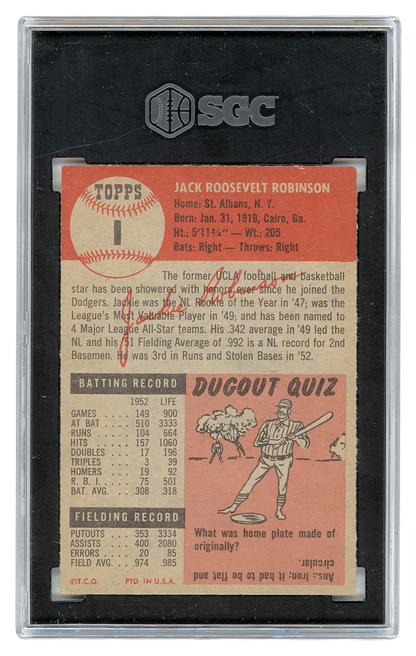 1953 Topps #1 Jackie Robinson SGC 6 EX-NM, nice centering; phenomenal color; freshly graded by SGC, Excellent to Near Mint