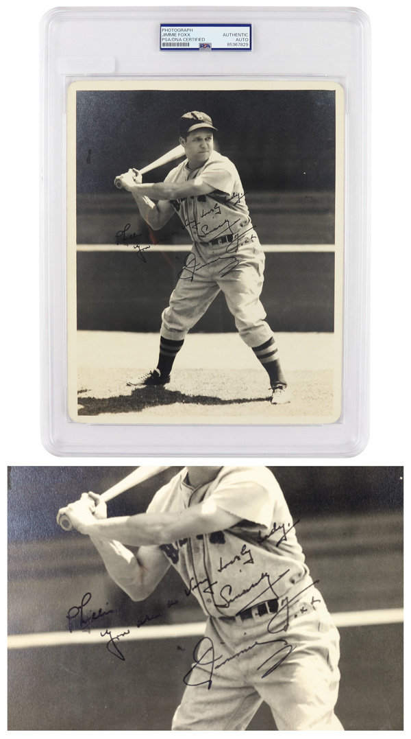 encapsulated by PSA; Foxx Wrote: "Phylis, you are a very lovely lady, Sincerely Jimmie Foxx"; one of a kind piece on a very old photo; must have for any collector. Shipping charges apply - weight 1.2 lbs. (Image)