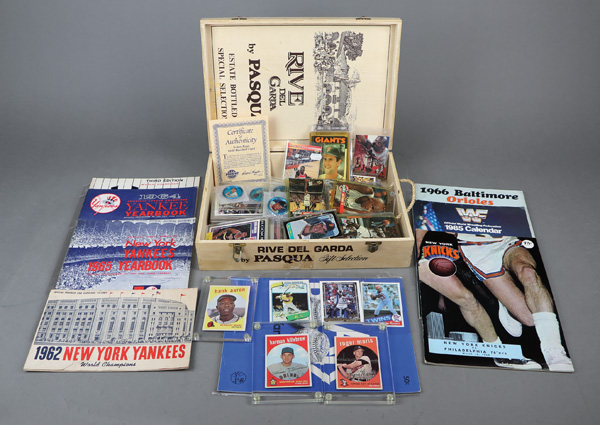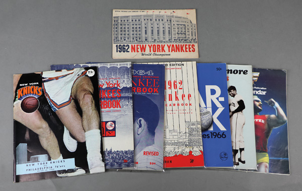 AL Champs Yearbook, 1965 New York Yankees Yearbook, 1966 New York Yankees Yearbook, 1966 Baltimore Orioles Yearbook, a 1968 New York Knicks Game Program, & a 1985 WWF Calendar (1959 toppscards in VG-EX condition, rest of the cards in NM-MT condition