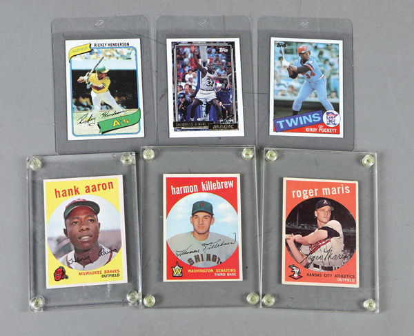 Hank Aaron, 1959 Topps #515 Harmon Killebrew, 1959 Topps #202 Roger Maris, 1992 Topps Gold #362 Shaquille O'Neal rookie, 1985 Topps Kirby Puckett rookie, 1980 Topps Rickey Henderson rookie, multiple Shaquille O'Neal rookie cards from different sets,