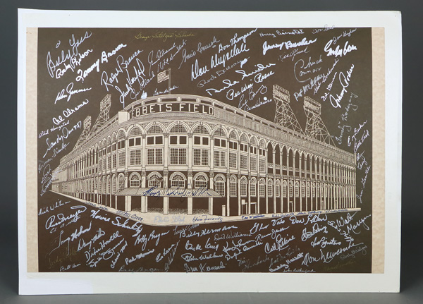 Roebuck, Billy Herman, Gene Hermanski, Ken Johnson, Dolph Camilli, Ransom Jackson, Carl Erskine, Johnny Rutherford, Joe Pignatano, Fred Kipp, Rocky bridges; above the stadium autographs include: Billy Loes, Rocky Nelson, Tommy Brown, Ralph Branca,