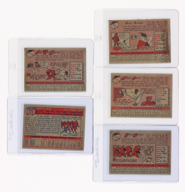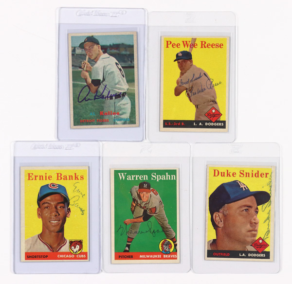 #310 Ernie Banks Signed, 1958 Topps #270 Warren Spahn Signed, 1958 Topps #375 Pee Wee Signed, & 1958 Topps #88 Duke Snider Signed; cards range from Poor-VG conditon; please inspect (5 cards total). These items have been previewed by our expert team