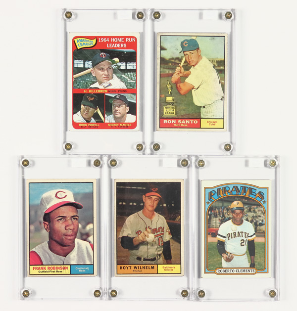1961 Topps High # #545 Hoyt Wilhelm, 1965 Topps #3 1964 Home Run Leaders Killebrew Powell Mickey Mantle, 1961 Topps #35 Ron Santo Rookie card, & 1961 Topps #360 Frank Robinson; please inspect condition; cards are in VG-EX condition for the most part