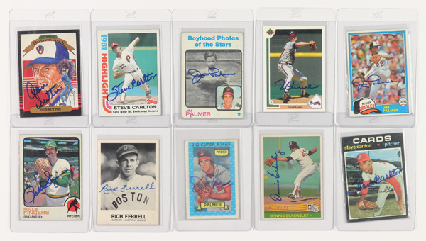 Donruss #639 Dennis Eckersley Signed, 1983 #199 Rick Ferrel Signed, 1974 Jim Palmer 3-D Card Signed, 1982 Topps Highlights #1 Steve Carlton Signed, 1971 Topps #55 Steve Carlton Signed, 1991 Upper Deck #480 Tom Glavine Signed, 1973 Topps #341 Jim