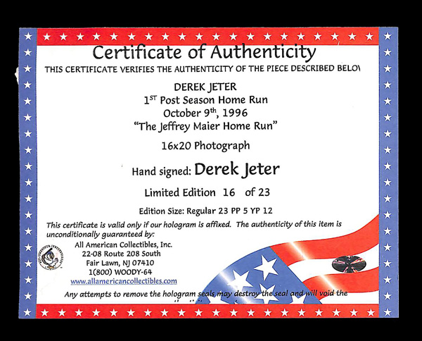 Home Run, "The Jeffrey Maier Home Run" October 9th, 1996; comes with COA. This item has been previewed by our expert team and we believe this item is genuine and will receive a certificate stating the same. Please advise at the time of bidding if you