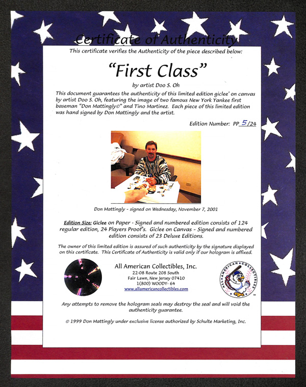 Don Mattingly Autograph Limited Edition Giclee On Canvas, hand signed by Mattingly and the artist Doo S. Oh; it is a Player