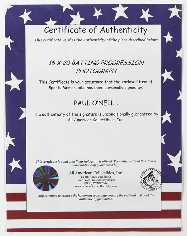 Paul O'Neil Autographed 16x20 "Batting Progression" Photograph, framed, ready to display; comes with COA. This item has been