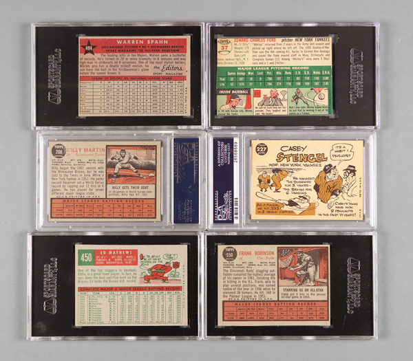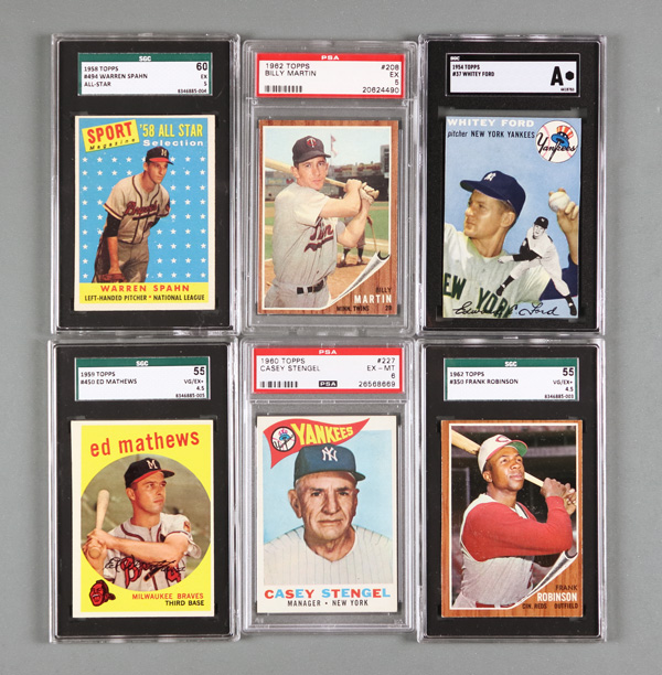 Frank Robinson #350 SGC 4.5 VG/EX+, 1954 Topps #37 Whitey Ford SGC Authentic, 1958 Topps #494 Warren Spahn All-Star SGC 5 EX, 1962 Topps #208 Billy Martin PSA 5, & 1960 Topps #227 Casey Stengel PSA 6 EX-MT (6 cards total). Shipping charges apply -