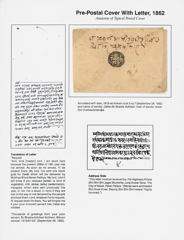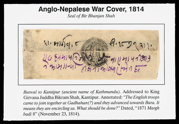 3001 cover 1814.1123 image1814 (Nov. 23), Neat Anglo-Nepalese War Cover from Butwal to King Girvana Juddha Bikram Shah, Kantipur, showing the seal of Bir Bhanjan Shah, with message "The English Troops came to join together at Gadhahan [?] and they advanced towards Bara. It means they are encircling us. What should be done?", Very Fine. (Image)