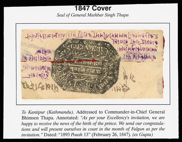 3003 cover 1847.0226 image1847 (Feb. 26), Seal of General Mathbar Singh Tapa, on exquisite cover to Commander-in-Chief General Bhimsn Thapa at Kantipur, with annotation "As per your Excellency's invitation, we are happy to receive the news of the birth of the prince. We send our congratulations and will present ourselves in court in the month of Falgun as per the invitation", Very Fine and appealing. (Image)