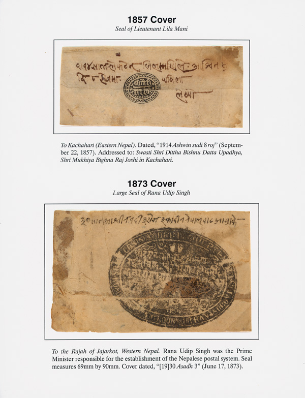 3004 cover 1857 image1857-73, Selection of Three Seals Covers, including 1873 entire to the Rajah of Jajakot, showing the large seal of Rana Udip Singh, the Prime Minister responsible for the establishment of the Nepalese postal system, fair strike of his seal, Fine to Very Fine. (Image) (Image2) (All Images)