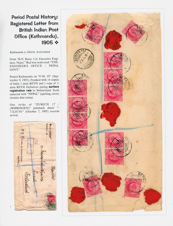 3005 cover 1905.0909 image1905 (Sept. 9), Registered "…/Col. Executive Engineer, Nepal" corner card cover from the British Indian P.O. in Kathmandu to Zurich (10.7), measuring 240 x 115mm, bearing on front and back King Edward VII ½a single and 14 examples of #1a, canceled by "Nepal" c.d.s., showing "R/Nepal' framed handstamp on front and "Exe. Engineer's Office/Nepal Govt." wax seals in red on reverse, Very Fine despite small faults. (Image)
