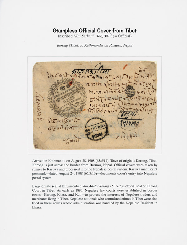 3006 cover 1908.0828 image1908 (Aug. 8), Tibet Official Unfranked Cover from Kerong, Tibet to Kathmandu (28.Aug.; 65/5/14) via Rasuwa, Nepal (24 Aug.; 65/5/10), showing large ornate official seal of the Kerong Court of Nepal, carried by runner at origin and then placed in the Nepal postal system for processing, there, with accompanying Rasuwa manuscript cancellation, Very Fine and distinctive.
