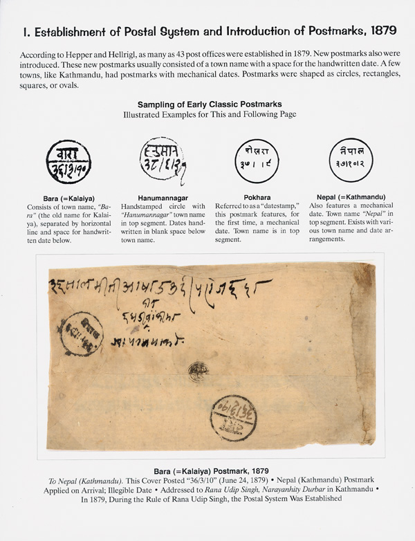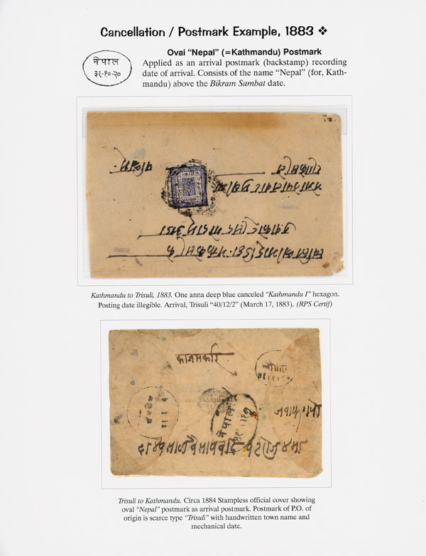 3007 cover   imageFascinating Definitive Exhibition Collection of Pre-stamp or Unfranked Mail, 1879-1910, group of 18, with a myriad of official and unusual usages, commencing with the early classical 1879-82 circular datestamps (5), 1881 official unfranked cover from Jaleswar to Kathmandu with "kaj sarkari" (official) endorsement, 1886-89 trio of envelopes from Lyanlyang via Dolakha showing various states of deterioration of the daters, 1887 envelope from Chitwan to Kathmandu showing unrecorded negative type of c.d.s., 1893 official envelope to Kathmandu showing "Rangeli" framed handstamp with date inserted by hand, 1887-93 official envelopes from Banke (2) to Kathmandu, showing "[Kaj] Sakari" with manuscript town name written over posting date and oval postmaster seal with manuscript date alongside respectively, 1891-94 (2) envelopes each with "Sisaghadi" handstamps, with the latter also showing "Chisapani" negative datestamp which later replaced "Sisaghadi" handstamp, 1904 late use of the "Shri Gorkha" datestamp on official cover, endorsed "kaj sarkari", and 1910 official cover from Kadarban to Kathmandu, showing unusual mechanical framed dater depicting each day the letter remained at post office before being sent onwards for delivery, Fine to Very Fine, fully imaged online. (PDF for this Lot) (Image) (All Images)
