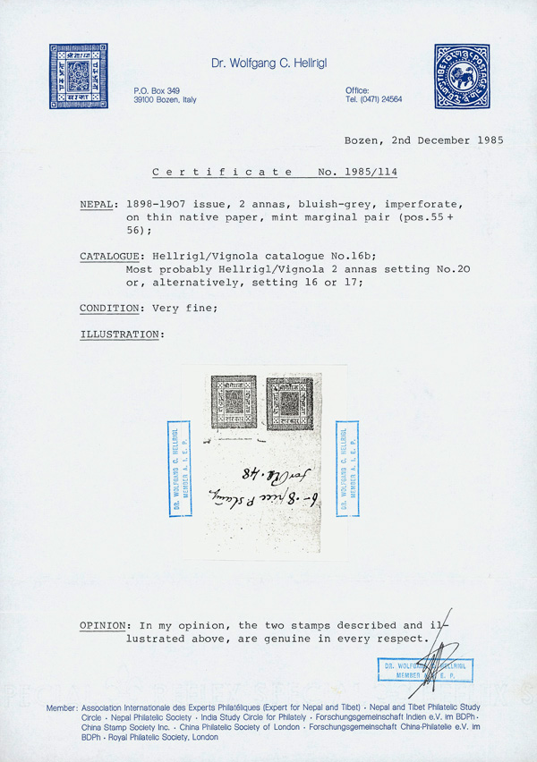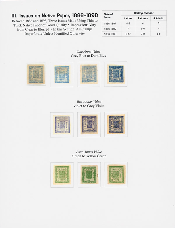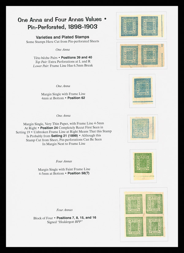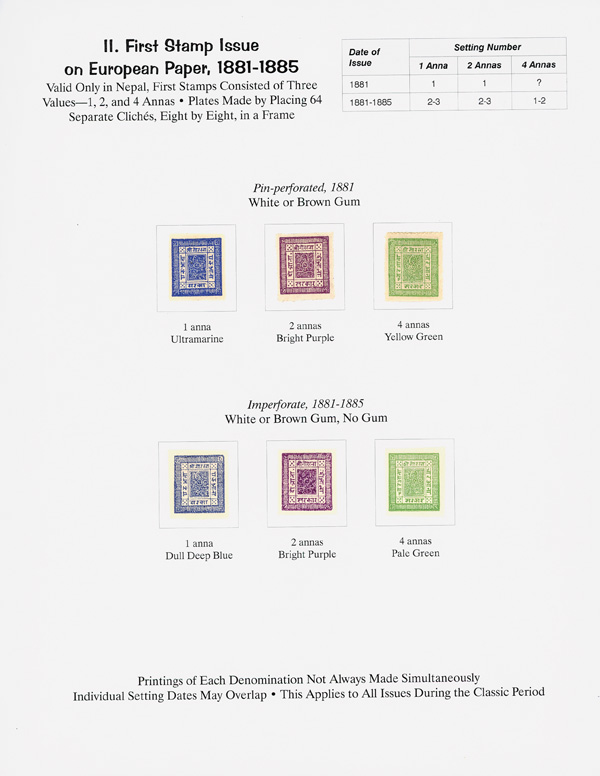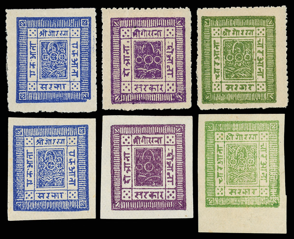 3009 og/ng 1-6 image1881-85, Crown and Khukris, European wove paper, 1a-4a complete, pin-perforated and imperforate (Scott 1-6 vars.), excellent colors, large margins, the pin-perforated first issue with part to much original gum and the 1a with plate variety "dented lower right corner", the imperforates without gum and the 4a with 6mm sheet margin at foot, Very Fine, with 1978 R.P.S.L. certificate for pin-perf 1a. (Image) (Image2) (All Images)