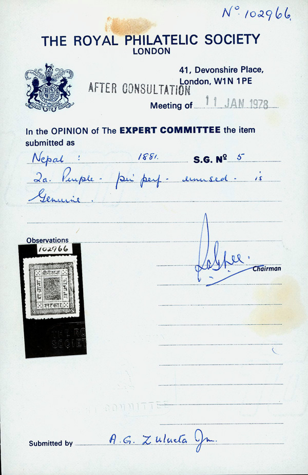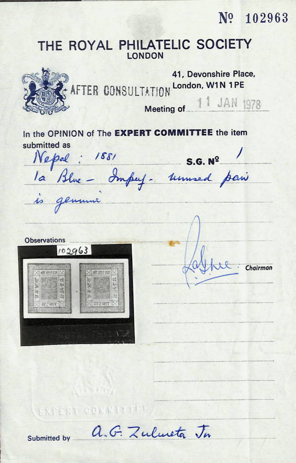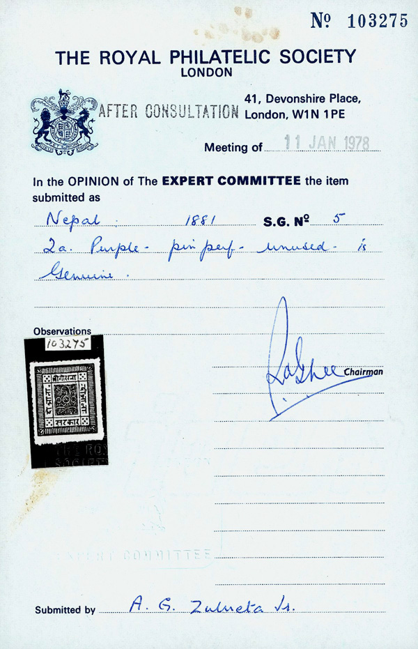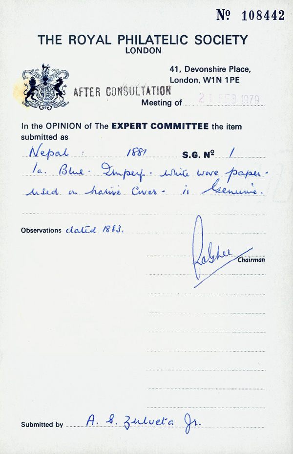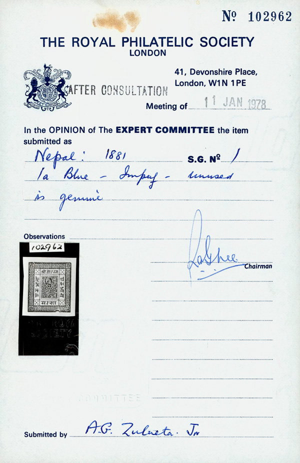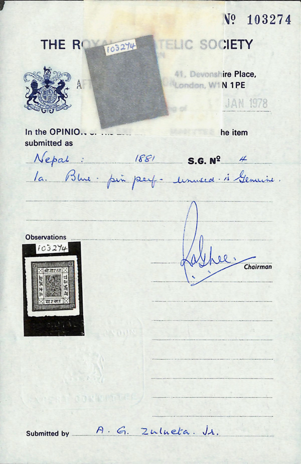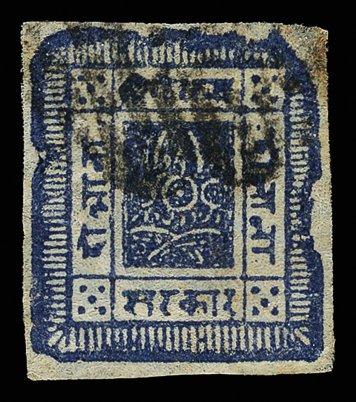 3019 cover 4 image1884 (June 7), Cover from Jumla to Kathmandu (6.13) bearing imperforate 1a ultramarine (Scott 4), large margins at sides, close to clear irregular margins at top and foot, superbly canceled by Jumla circular barred handstamp; cover a little reduced at right, Fine to Very Fine, with 1978 R.P.S.L. certificate. (Image)