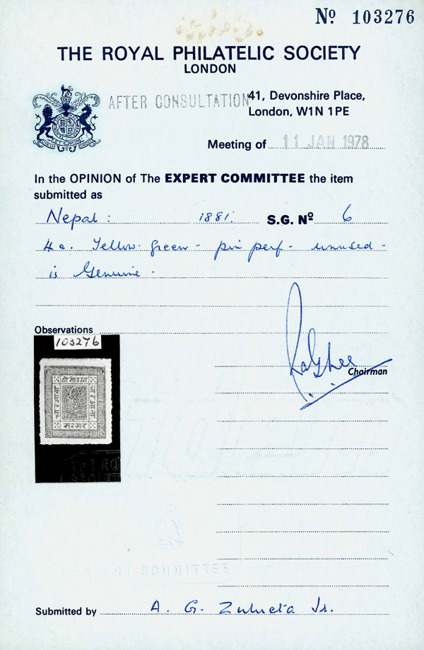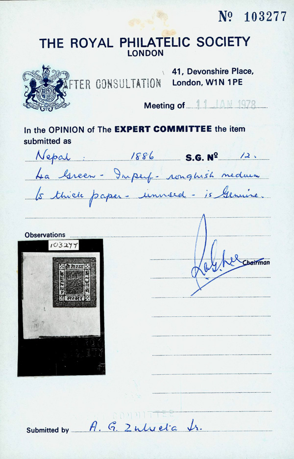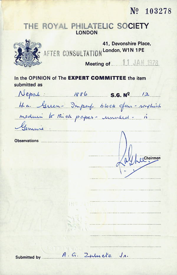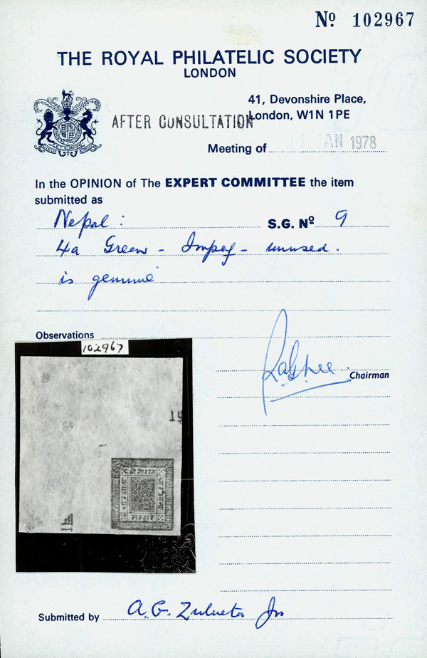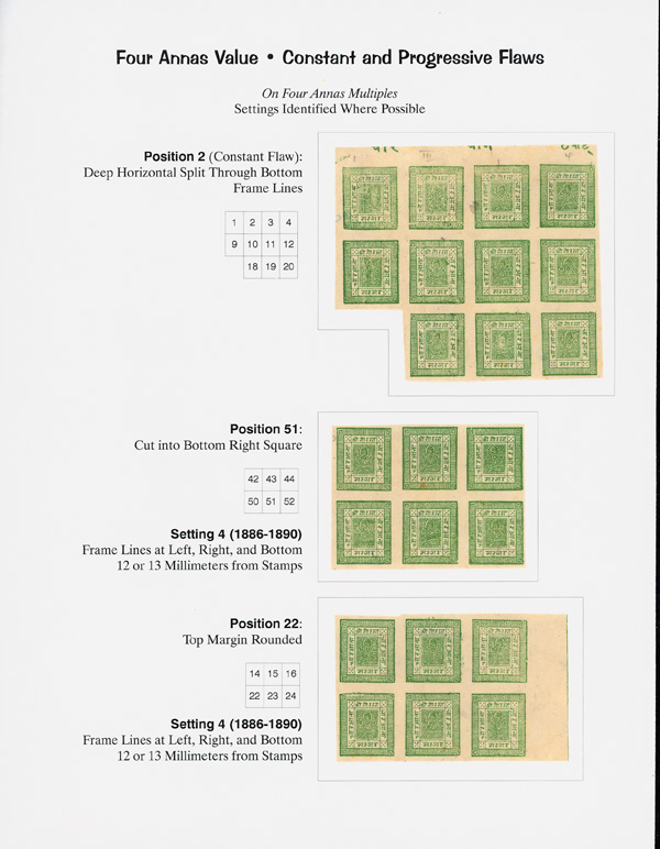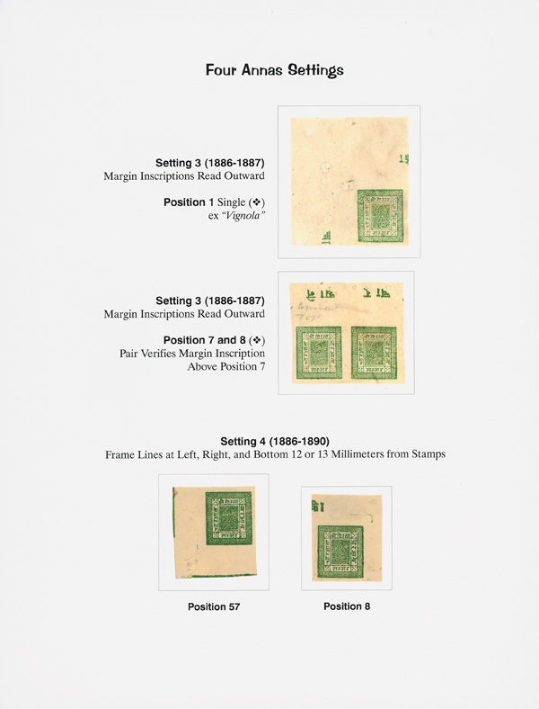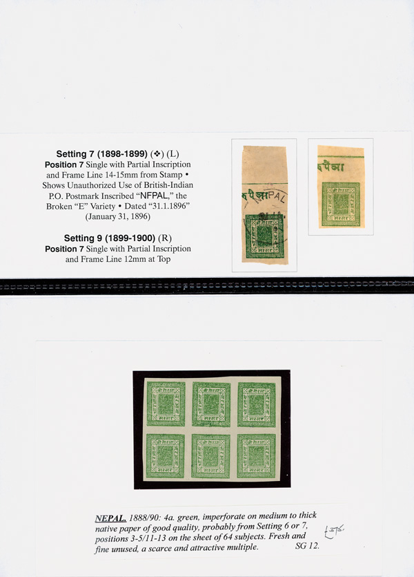 3034 ng 9 image1898-1907, Crown and Khukris, native wove paper, imperforate, 4a green, choice selection (Scott 9), mainly unused selection of marginal examples and blocks with shades, including 1886-87 4a green Setting 3, enormous corner example from position 1, horizontal pair positions [7-8], with marginal inscriptions or frame lines, corner examples (2) Setting 4, positions 8 and 57, marginal imprints (2, one used), and 4a blocks of six (3) and block of 11, without gum as issued, Fine to Very Fine, with 1978 R.P.S.L. certificates for two (including the first). (Image) (Image2) (Image3) (Image4) (Image5) (All Images)