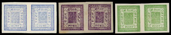 3010 ng 4-6 image1881, Crown and Khukris, European wove paper, imperforate, 1a-4a complete (Scott 4-6), horizontal pairs, the 1a from Setting 3 in a milky blue shade; bright colors, large even margins, the 1a with plate variety [39] "dented lower right corner", without gum as issued; the 3a has faintest traces of rust in lower right corner on reverse, otherwise Very Fine, with 1978 R.P.S.L. certificate for the 1a. (Image) (Image2) (All Images)