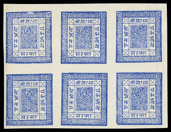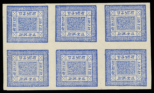 3013 ngbl 4 image1881, Crown and Khukris, European wove paper, imperforate, 1a ultramarine, Setting 1 (Scott 4), block of six [10-11/18-19/26-27], nice color and clear impression, without gum as issued, Very Fine. (Image)