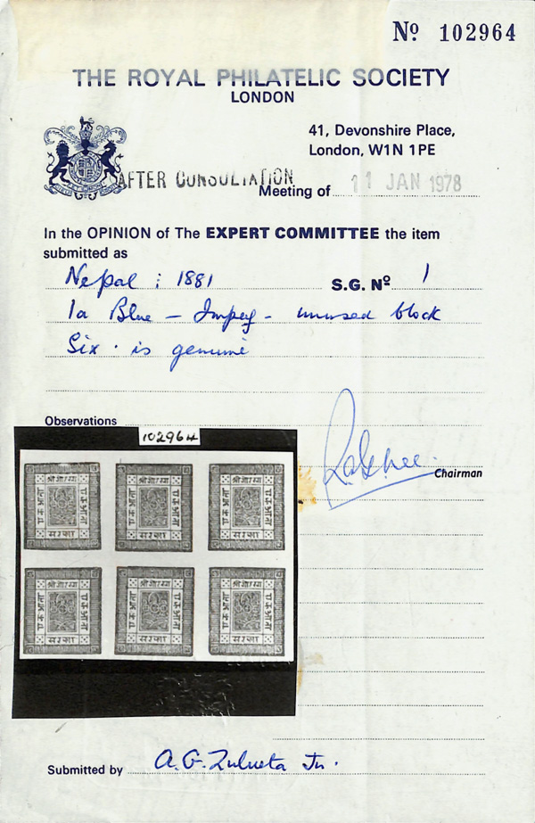 3012 ngbl 4 image1881, Crown and Khukris, European wove paper, imperforate, 1a bright ultramarine, Setting 1 (Scott 4), block of six [4-5-6/12-13-14], position [12] is the short cliché and [14] has rounded lower left corner; bright fresh color, without gum as issued; light horizontal bend across top row of stamps, Fine to Very Fine, with 1978 R.P.S.L. certificate. (Image) (Image2) (All Images)