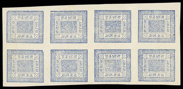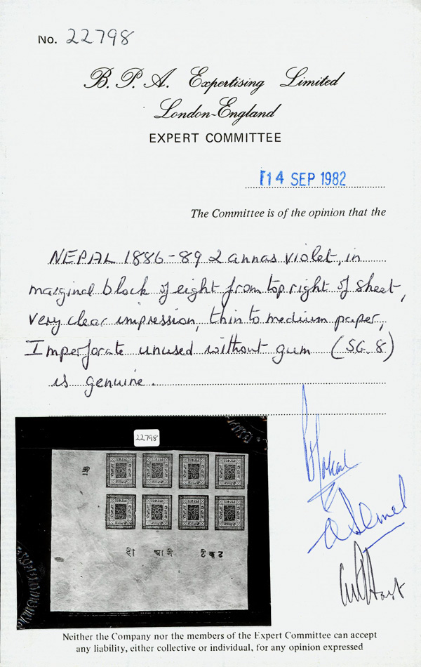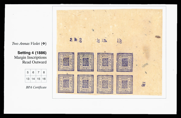 3028 ngbl 8 image1886-98, Crown and Khukris, native wove paper, imperforate, 2a violet, Setting 4 (Scott 8), fresh block of eight from the top right corner of the sheet with marginal inscriptions, without gum as issued, Fine to Very Fine, with 1982 B.P.A. certificate. (Image) (Image2) (All Images)