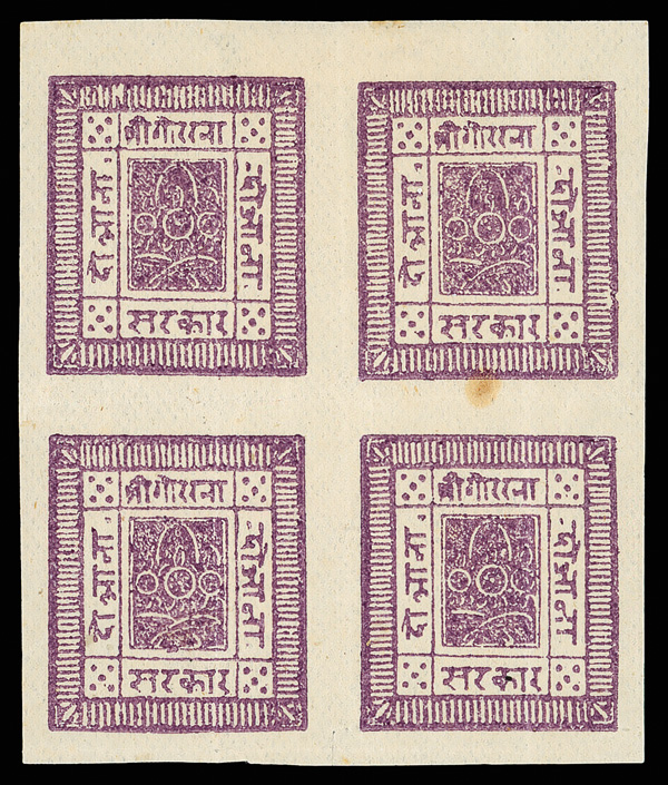 3015 ngbl 5 image1881, Crown and Khukris, European wove paper, imperforate, 2a purple, Setting 2 (probably) (Scott 5), block of four [4-5/12-13], clear color, large margins all around, without gum as issued; two neat light vertical creases and horizontal crease between central row of stamps, position [5] has small age spot at top, still Fine to Very Fine for this scarce block. (Image)