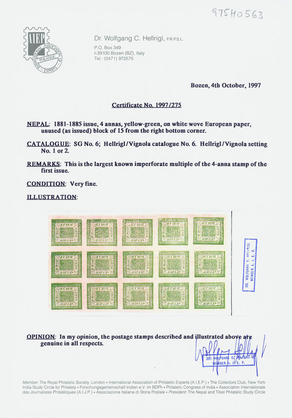 3016 ngbl 6 image1881, Crown and Khukris, European wove paper, imperforate, 4a yellow green, Setting 1 or 2 (Scott 6), bottom right corner margin block of 15, position [56] has the constant plate variety "rounded lower margin at foot"; deep color and characteristic impression and large even margins, without gum as issued; a barely perceptible vertical crease crossing the first row of stamps at left which is of no consequence and not mentioned on the accompanying certificate, Very Fine, a great rarity, with 1997 Hellrigl AIEP certificate.