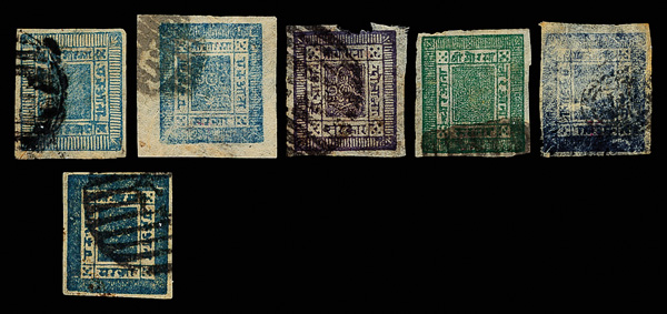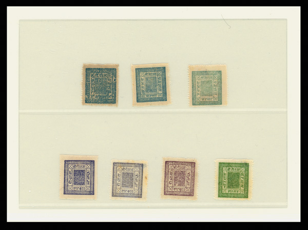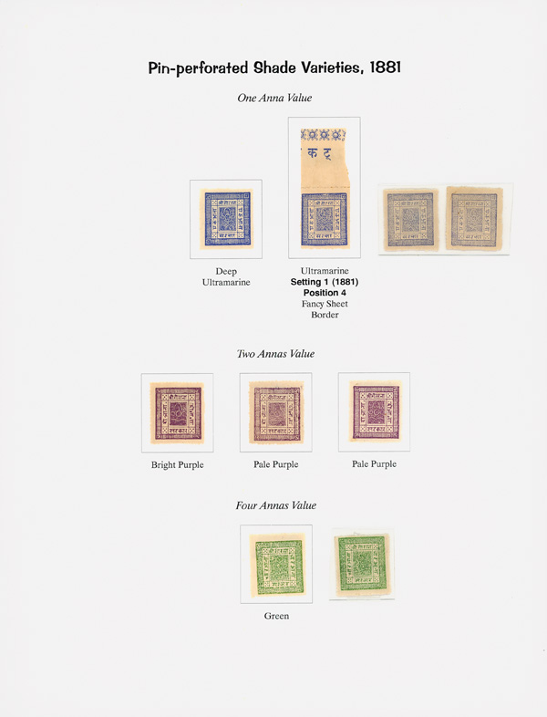 3017 og/O 1-6 imageFirst Issue Mainly Unused Specialized Collection, 1881 (Scott 1-6), replete with shades, impressions, and plate varieties, as well as 1a cancellations, presented to the highest standard, comprising pin-perforated 1a unused (5, one Setting 1, position 4 with fancy sheet imprint and border), 2a (5), 4a (2), and imperforate 1a (14), 2a (7), 4a (7), also interesting cancellations on 1a (10) and superb 8a tied by complete "Kathmandu 1" on piece; a few small faults, mainly Fine to Very Fine, fully imaged online. (PDF for this Lot) (Image) (Image2) (Image3) (All Images)