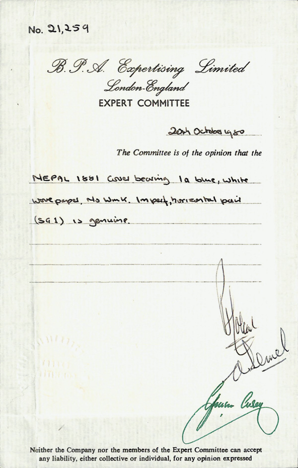 3020 cover 4 image1885 (Sept.), Local Kathmandu Cover (6.13) bearing imperforate 1a ultramarine (Scott 4) vertical pair (Scott 4), sharp impression, large to clear margins, ideally canceled by "Kathmandu 1" hexagonal handstamp, with Kathmandu delivery datestamp (9.4) on reverse, Very Fine, and a scarce local double rate use, with 1980 B.P.A. certificate. (Image) (Image2) (All Images)