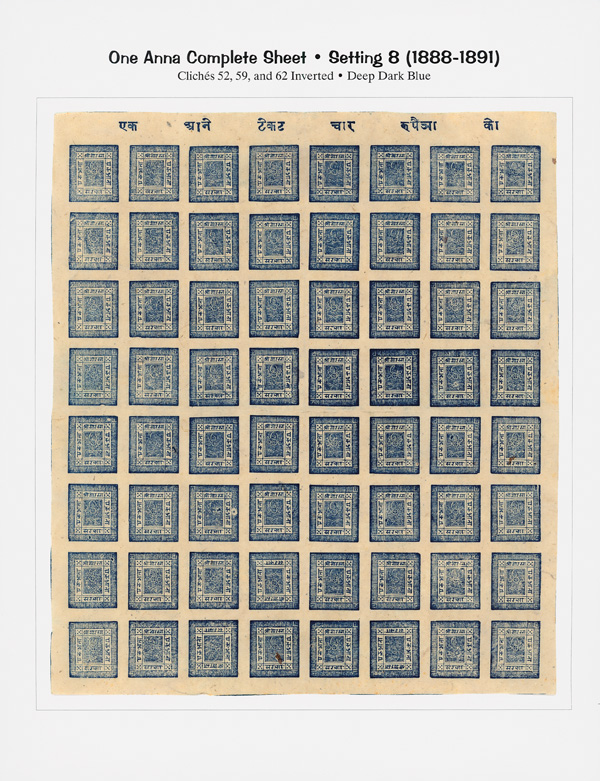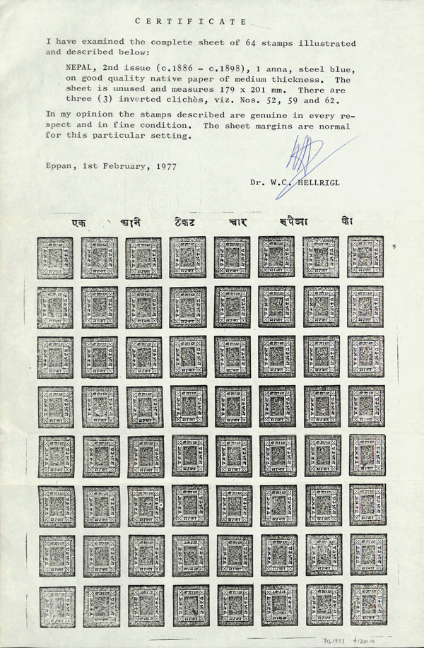 3024 ngbl 7 image1886-98, Crown and Khukris, native wove paper, imperforate, 1a steel blue, Setting 8 (Scott 7), complete sheet of 64 with marginal imprints at top, clichés 52, 59, and 62 are inverted (tête-bêche), without gum as issued; central vertical and horizontal folds in middle rows between stamps, Very Fine. Only approximately 15 sheets recorded, with 1977 Hellrigl certificate. (Image) (Image2) (All Images)