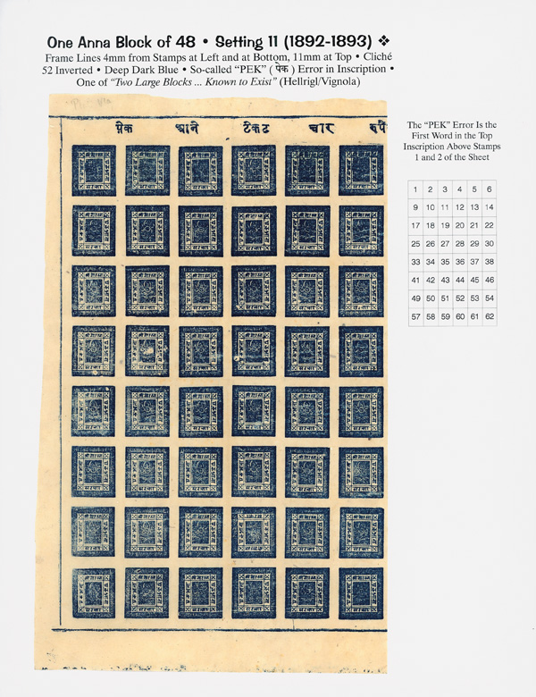 3026 ngbl 7 image1886-98, Crown and Khukris, native wove paper, imperforate, 1a deep dark blue, Setting 11 (Scott 7), block of 48 from the left of the sheet showing marginal frame lines on three sides and marginal inscriptions at top with "PEK" error in inscription, cliché 52 inverted; rich color; central horizontal and vertical filing fold, without gum as issued, otherwise Very Fine and fresh. One of two large blocks recorded. (Image)