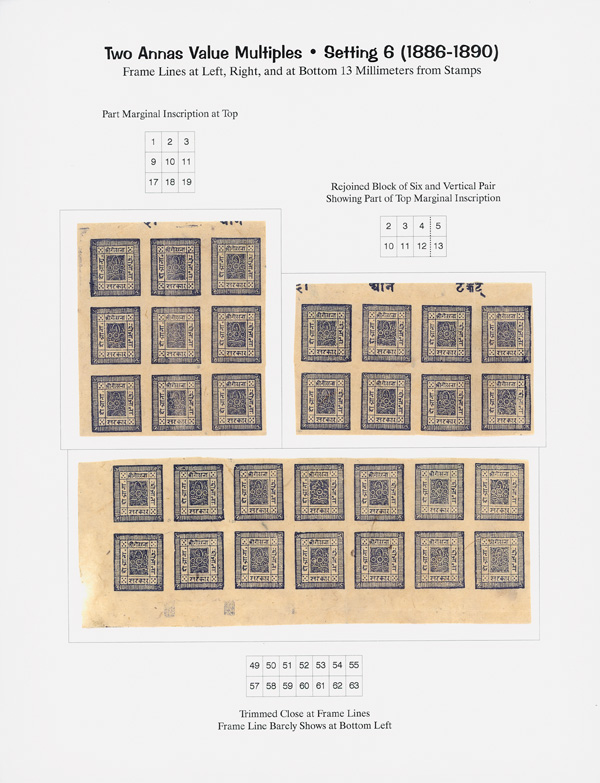 3025 ngbl 7 image1886-98, Crown and Khukris, native wove paper, imperforate, 1a gray blue, Setting 8 (Scott 7), reconstructed sheet of 64 with marginal imprints at top, composed of two blocks of eight and four blocks of twelve, clichés 52, 59, and 62 are inverted (tête-bêche); minor ageing in sheet margins, without gum as issued, Fine to Very Fine. (Image)
