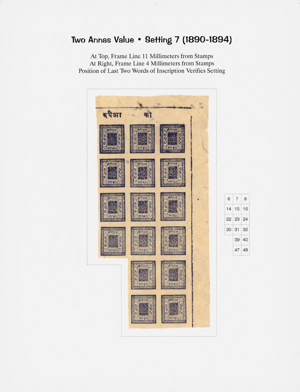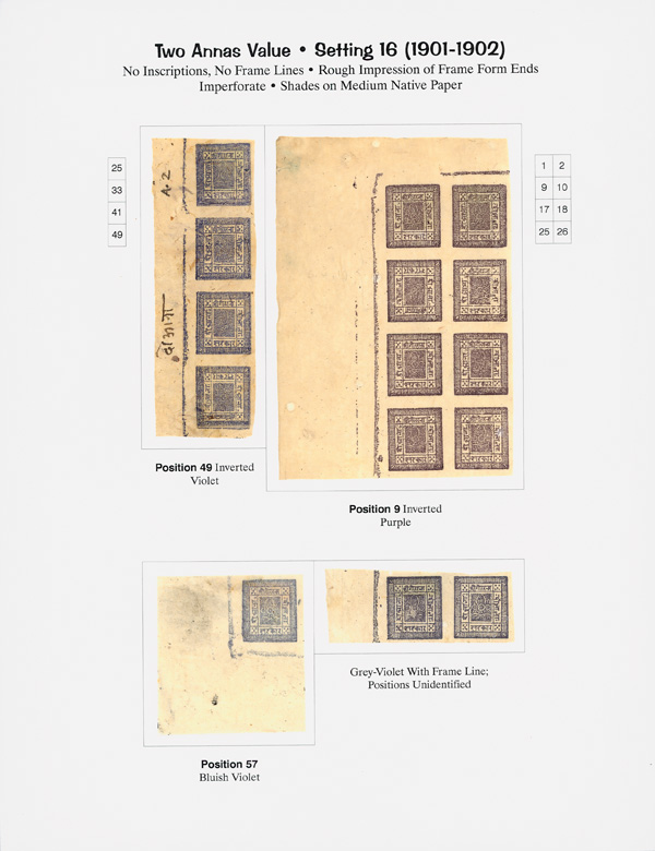 3030 ngbl 8 image1886-98, Crown and Khukris, native wove paper, imperforate, 2a deep violet, Setting 7 (Scott 8), irregular block of 16 from the top right corner of the sheet with marginal inscription at top and frame lines on two sides, without gum as issued, Fine to Very Fine. (Image)