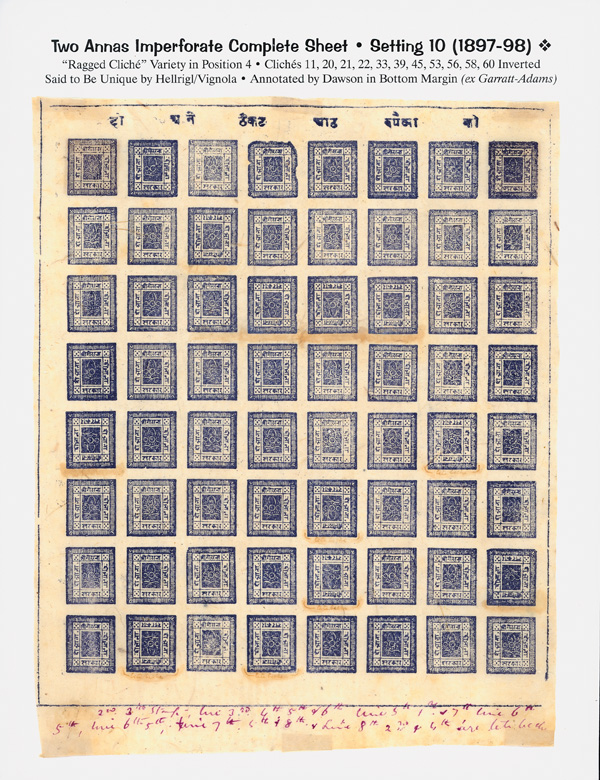 3031 ngbl 8 image1886-98, Crown and Khukris, native wove paper, imperforate, 2a violet blue, Setting 10 (Scott 8), complete sheet of 64, the famous "Ragged Cliché" plate variety is position 4; large margins all around with complete marginal inscription at top and frame lines; light staining in places, annotated by L.E. Dawson in huge sheet margin at bottom, without gum as issued, Fine to Very Fine, ex Garratt-Adams.