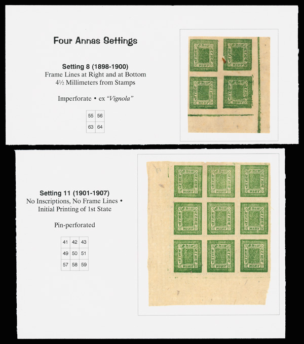 3035 ng 9 image1898-1907, Crown and Khukris, native wove paper, imperforate, 4a green, blocks (Scott 9), a pair of unused positional blocks, comprising 1898-1900 4a dark green, Setting 8, block of four from the lower right corner of the sheet with frame lines on two sides, and 1901-07 pin-perforated 4a bright green block of nine from the lower left corner of the sheet, without gum as issued, Very Fine, the first with 1978 R.P.S.L. certificate. (Image) (Image2) (All Images)