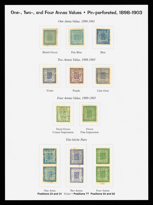 3037 ng 7-9 image1895-98, Crown and Khukris, native wove paper, imperforate, unused selection of pin-perforated issues (Scott 7-9), with shades and varieties, including 1a pale blue horizontal tête-bêche pairs (2), and 1a, 2a, and 4a vertical tête-bêche pairs; some toned spots, without gum as issued, Very Good to Fine. (Image) (Image2) (Image3) (All Images)