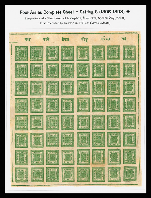 3038 ngbl 9 image1895-98, Crown and Khukris, native wove paper, pin-perforated, 4a green, Setting 8 (Scott 9 Var.), complete sheet of 64, marginal inscription at top and frame lines all round, good color, one area of toning mostly affects position 54, without gum as issued, otherwise Fine. A rare multiple, ex Garratt-Adams. (Image)