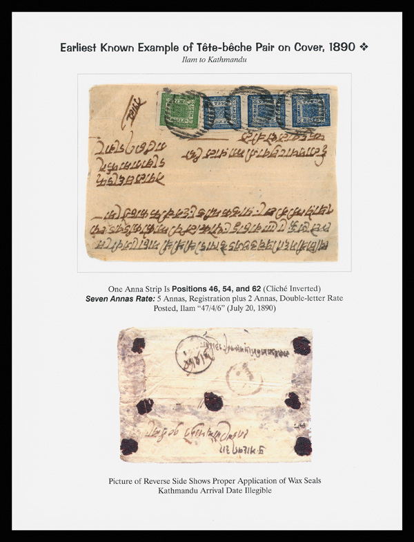 3040 cover 1890.072 image1890 (July 20), Registered Cover from Ilam to Kathmandu (arrival), bearing 1a deep ultramarine vertical strip of three [46/54/62], cliché 62 inverted, and 4a deep green, canceled by "Ilam" circular barred handstamp, stamps have some light creasing, Very Fine appearance for what is purportedly the earliest use of a tête-bêche on cover (5a registration + 2a double letter rate = 7a postage), Very Fine. (Image)