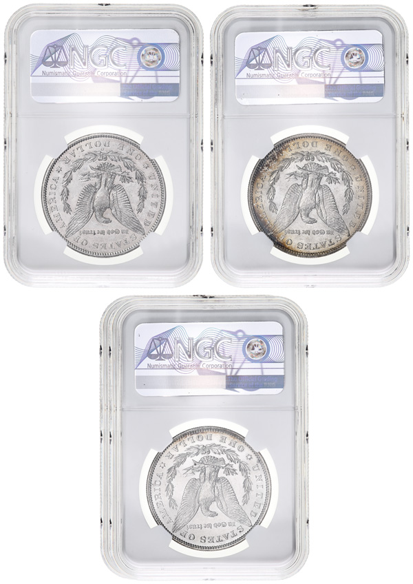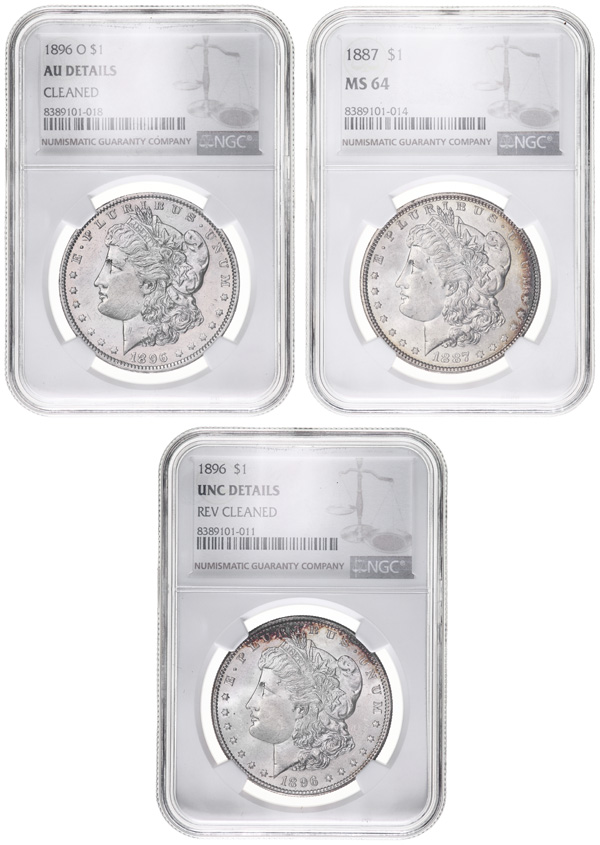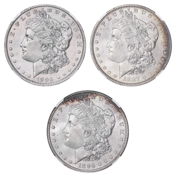 Group of (3) NGC Graded Morgan Silver Dollars, 1887 // 1896, includes: 1887 MS64, 1896 UNC DETAILS - REV CLEANED, & 1896-O