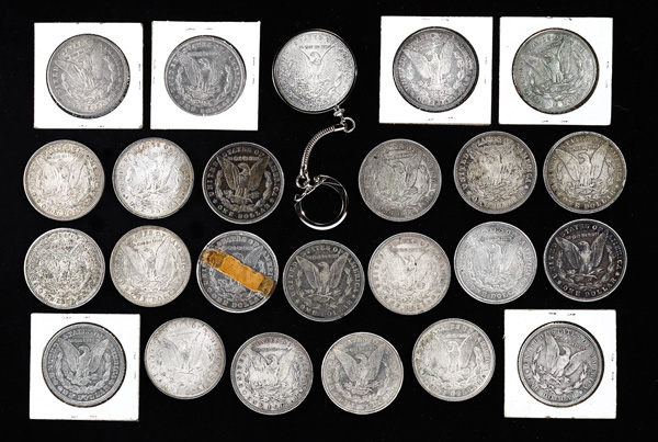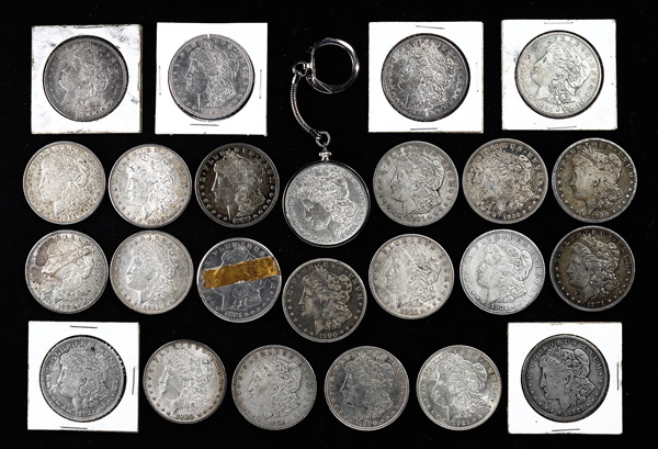 U.S. Morgan Dollar Collection, 1886-1921, assortment of 24 total Morgan Dollars; includes: 1886-O (encased in bezel), 1896,