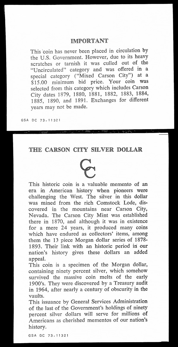 1884-CC Uncirculated; in OGP; please inspect (3 items). Shipping charges apply - weight 1.4 lbs. (PDF for this Lot) (Image)